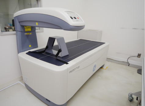 - 骨密度検査はいくつか方法がありますが、当院で行っているのは、『DXA(デキサ)X線骨密度測定装置』による検査です。エネルギーの低い2種類のX線を使って、骨折しやすい腰の骨(腰椎)と脚のつけ根(大腿骨頚部)の骨塩量を測定します。DXA法は、日本骨粗鬆学会の「骨粗鬆症の予防と治療ガイドライン」においても推奨されている正確で優れた検査方法です。